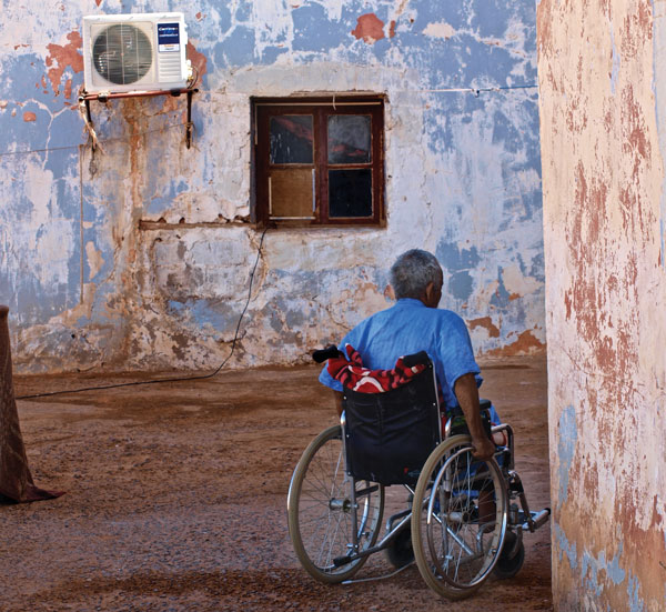 For some 20 years following the occupation, there was an armed struggle that left many thousands dead and many hundreds wounded. Mr. Hanshi is director of a landmine hospital near one of the settlements, founded by a St. John Ambulance mission to Algeria. There are around 60 patients, wheelchair-bound, paraplegic or quadriplegic in his charge. Aged patients are the majority and are housed in small, bare rooms. Some of them have their families for company; others have just the handful of staff employed to assist them.