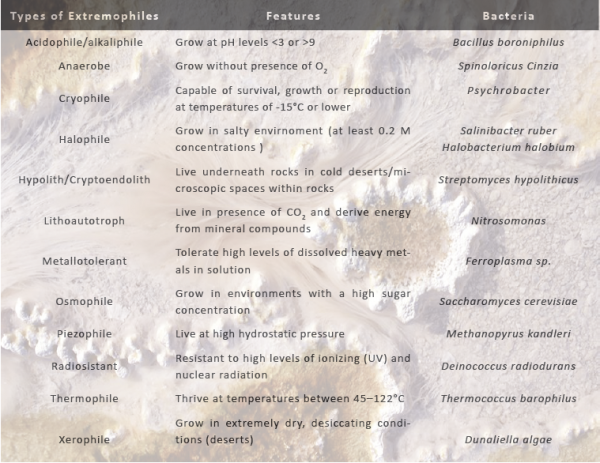 The study of planets and moons other than our own highlights the diversity of habitats that life might have to contend with. Therefore any life that we find on these worlds will be very different to us. This life falls into the category of extremophiles, a group of some of the hardiest microorganisms that can withstand and thrive in extremes of temperature, pressure and radiation, as well as salinity, toxicity, pH and limited availability of liquid water2. The best-known examples are thermophiles, such as ‘Strain 121’ and Methanopyrus kandleri, that savour the conditions around geothermal hot springs found in volcanic environments and at the bottom of the ocean.