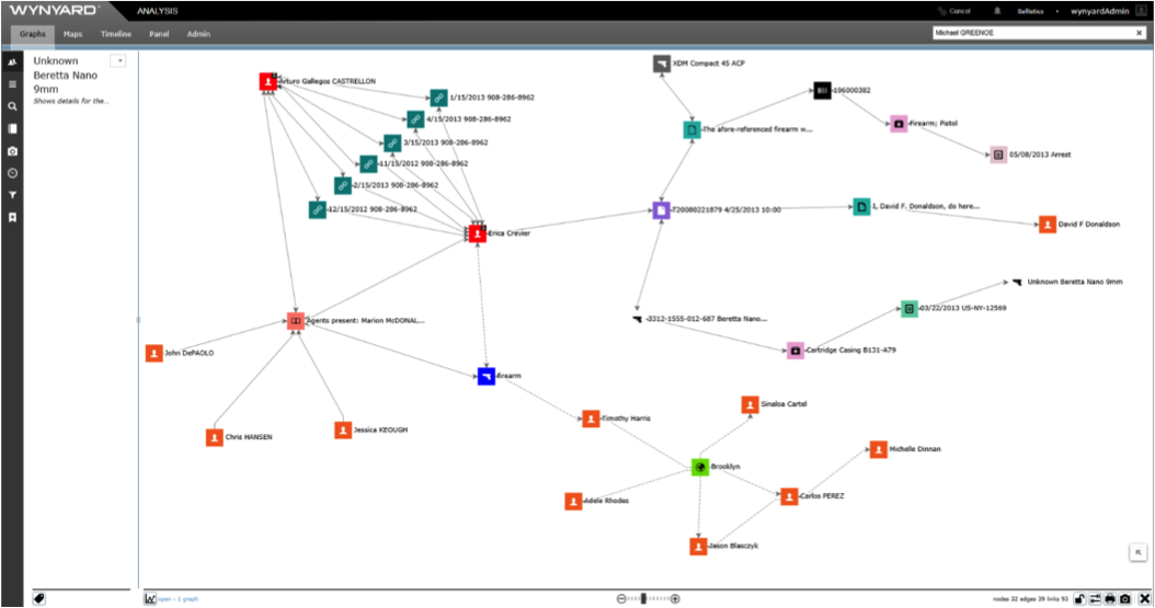 Individual criminal actors are represented as nodes, along with locations, gangs, bank accounts, etc. These nodes are then linked together representing relationships between the entities; such as communication, offender movement, known associates. As the network expands, patterns and hidden relationships can be uncovered by statistical methods.