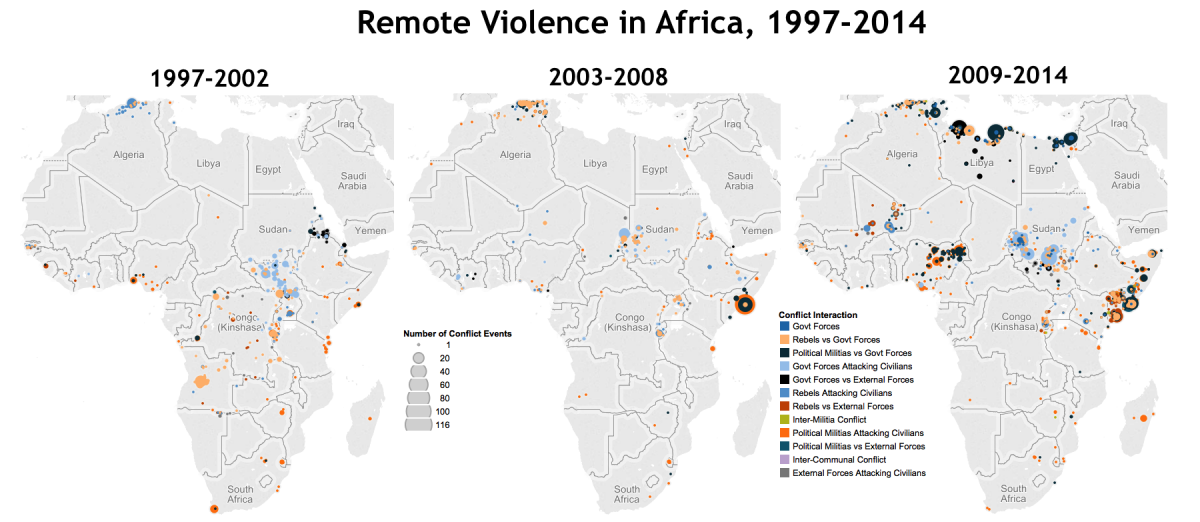 The techniques and strategies of violence are also changing. Evidence of this includes a recent spike in the use of remote violence tactics, especially across the African continent. Improvised Explosive Devices (IEDs) function well as symbolic weapons; “by targeting agents of the state, civilians, popular monuments or symbols, IEDs can be used to undermine confidence in the government and coerce public opinion and government policies11”.12 This type of violence can be used to expose a regime’s vulnerability to violence, or a government’s inability to protect its citizens.13 For non-state actors such as political militias that are typically weaker than government forces, remote violence is an ideal tactic to either damage state forces with minimal risk, or to coerce the state without controlling it. This has been observed in numerous settings, including Afghanistan.14