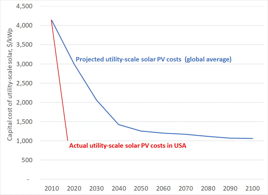 There are some understandable reasons why. There must surely be a fear amongst any scientific group incorporating as-yet uninvented technologies into their models that they will get laughed out of the room. "That's science fiction, not science fact" (until it becomes fact, that is). And how can the cost and performance of such technologies be represented when they haven’t yet been invented? Doing so is clearly much more challenging than working with existing technologies. Yet some examples suggest we haven’t done particularly well even on known technologies (see figure below). And in his thought-provoking blog from 2017, Auke Hoekstra outlines an intriguing way in which we can characterise longer-term, more radical technological progress: he uses the example of the futurist Ray Kurzweil, who realised that he could predict when yet-to-be invented technologies might be commercialised, by understanding the rate of progress in technologies that support them (for example Better Cameras + Enhanced Pattern Recognition + Greater Computing Power = Autonomous Vehicles).