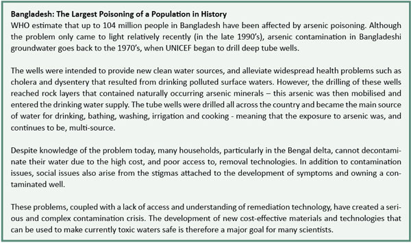 Arsenic-contaminated drinking water has been identified in many countries around the world including Argentina, Australia, India, Mexico, Thailand and Bangladesh. The World Health Organisation (WHO) declared the problem in Bangladesh to be ‘the largest poisoning of a population in history’, with up to 104 million people affected.