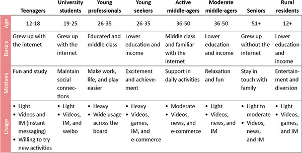 The Internet in China continues to be dominated by entertainment, especially video. But there is growing usage in e-commerce, community-oriented, and information activities. The eight segments, however, do not participate in these activities equally.