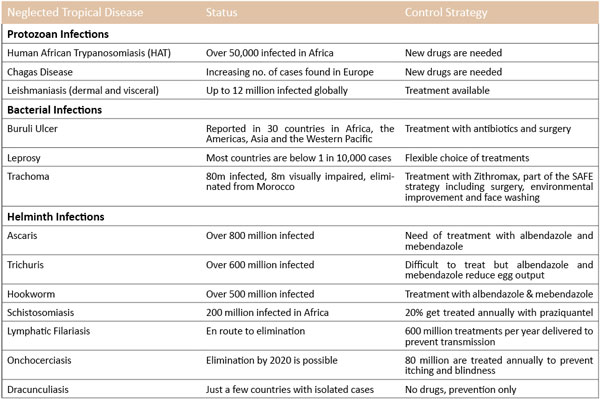 The 13 most important Neglected Tropical Diseases (NTD) include seven which can, and should, be controlled with the annual distribution of four drugs, all of which are donated by pharmaceutical companies or purchased for donation by foundations or governments. Another NTD – Guinea Worm – is close to eradication using health education and clean water supplies. Three others are protozoan diseases, which are killers but fortunately with limited distribution.