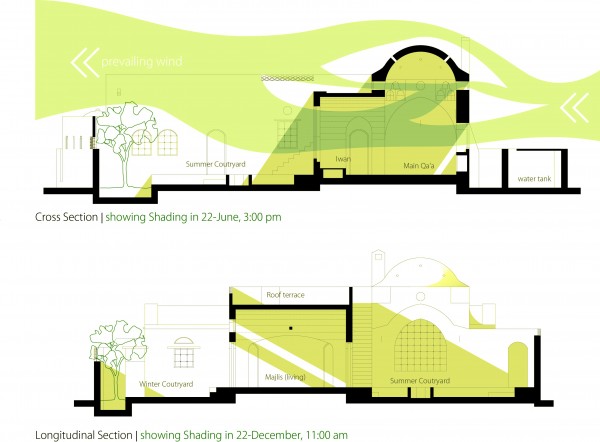 The open courtyards are the focal point of all activities, with all living spaces overlooking the courtyards. Their accompanying vegetation and use of water fountains and air circulation provide a naturally controlled microclimate, which is a celebrated aspect of most Arab traditional architecture.