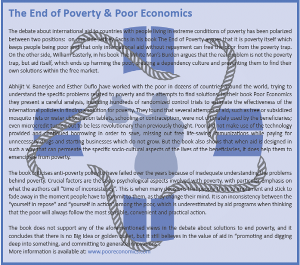 For nearly the last half-century, we have heard that a shift of 1-2% of GDP from the developed to the developing world would raise as many as 1.5 billion people to a level that would assure the benefactors that the beneficiaries are on their way to lives much like the benefactors’ own. However, this widely advertised claim is best taken as ‘inspirational bookkeeping’, a phrase that should be understood not simply as a euphemism for ‘false’ or ‘delusional’. Nevertheless, a hard-headed economist would say that the stated figure ignores ‘transaction costs’ – that is, the costs of providing the background conditions that would allow the stipulated 1-2% transfer of income to work the desired magic. In what follows, these hidden costs are discussed in light of the recent eye-opening work, Poor Economics by two MIT economists, Abhijit Banerjee and Esther Duflo.
