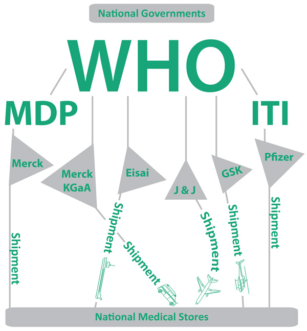 Drugs are often imported to the recipient country with the assistance of the World Health Organisation country representative, and then delivered to the respective National Medical stores. From the stores, nationwide drug distribution is the responsibility of the Ministry of Health.