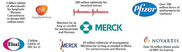 In 1985 a drug donation of mectizan (ivermectin) led to a mass drug administration to over 100 million people a year in Africa to protect them against river blindness. Where once 50% of people over 40 years of age were blind today they all have their sight. By 2013 several more donation commitments have been made by several pharmaceutical companies with the result that the 1 billion poor people in need of drugs can now receive them free of charge.