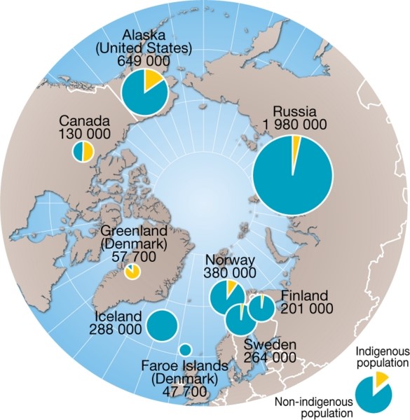 Depending on where boundaries are set exactly, the Arctic’s population could be anywhere from approximately four million to thirteen million people. About 10% of Arctic inhabitants are indigenous, covering 40 different groups, including Sámi, Inuit, Nenets, Yakuts, and Aleuts. Although current Icelanders descend from the first major population group to settle the islands, they are not considered to be indigenous.