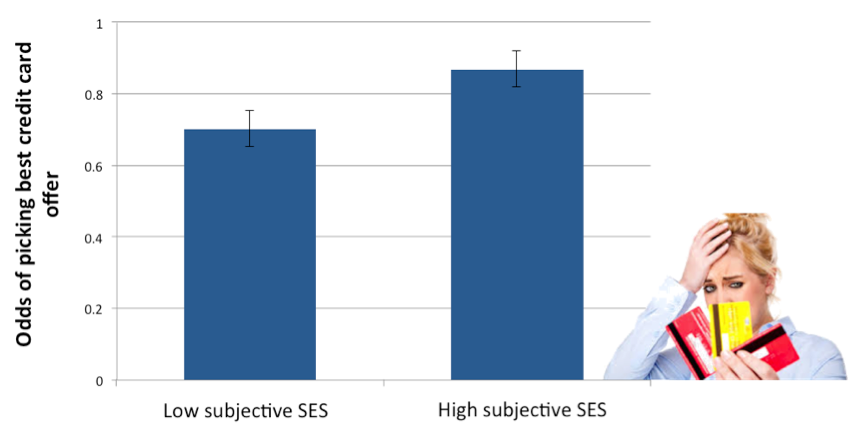 Inspired by these findings, my recent research has looked at the cognitive impact not of having few resources, but of realising that one has far fewer resources than others. In one series of studies, Jim Sidanius and I have shown that giving middle class participants the temporary perception that they sit low on the socioeconomic ladder of the United States leads them to perform worse in a range of measures of cognitive function. People in the ‘low SES’ condition were also worse at picking out the best of a set of three fictitious credit card offers, evidence that the negative cognitive impact of feeling one is at the bottom of society carries over into one’s financial decisions19. These findings are important because this form of ‘socioeconomic status anxiety’ matters for people at all levels of the societal ladder, not just the poor, and will likely grow in potency as economic inequality rises20.