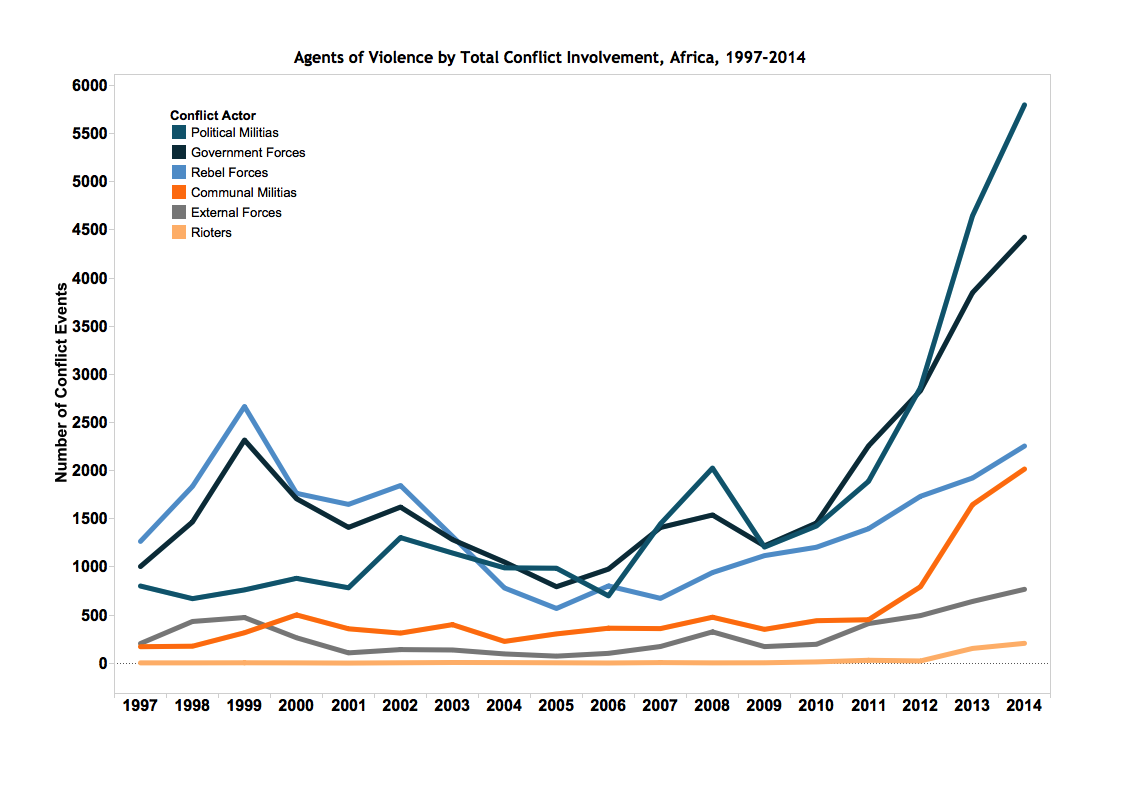 We focus on Sub-Saharan Africa, where intrastate conflict is now more common than the interstate conflicts more prevalent during the last century. Civil and transnational wars are decreasing, while domestic political instability continues to increase. Replacing rebel groups, in the past 10 years political militias have become responsible for over a third of all organized, armed conflict events on the continent, closely followed by government forces.
