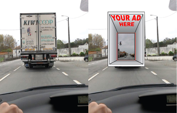 This has been the inspiration for the design of the See-Through System (STS) overtaking assistant3, which works as follows. A vision- obstructing vehicle such as a bus or a truck is equipped with a dashboard camera and a V2V communication device. As a car equipped with a virtual windshield approaches the vehicle in front, it establishes a real-time video stream from the windshield camera to the virtual windshield. Based on the vision-obstructing vehicle’s dimensions and relative position to the car, the video stream is overlaid onto the vehicle using the AR capabilities of the virtual windshield and computer vision to seamlessly overlap the preceding vehicle. A virtual depth effect is added to the frame surrounding the video in order to account for the blind spots created by the vehicle’s length. The end result is a transparent vehicle that is inherently safer to overtake – and the ad shown on the back of the original vehicle can be replaced by a new virtual ad, specifically targeted at the overtaking driver.